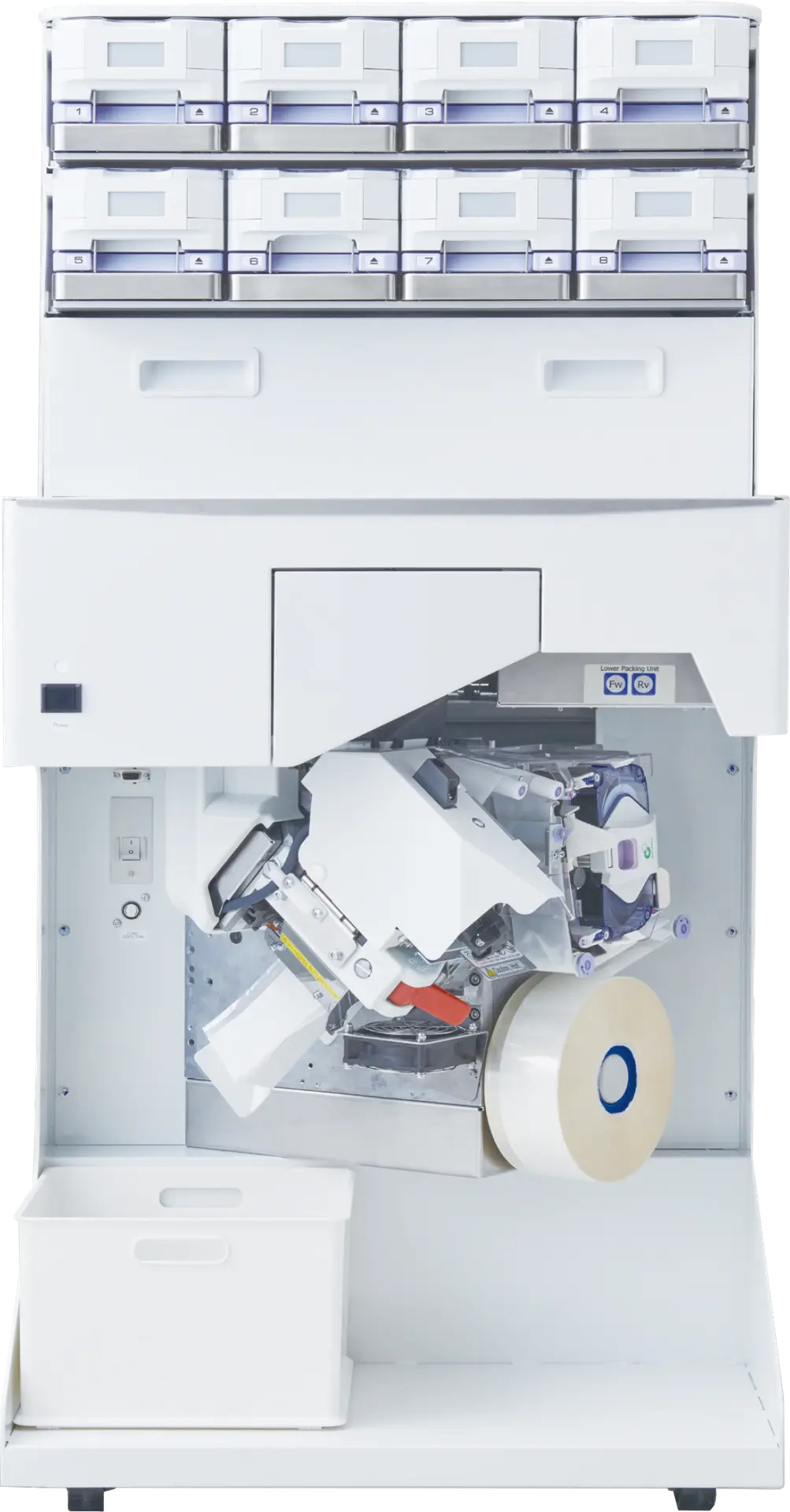 The Micro is a starter machine for the production of medication pouches. Most medications are processed through Universal Cassettes, with remaining items prepared in the integrated tray unit.